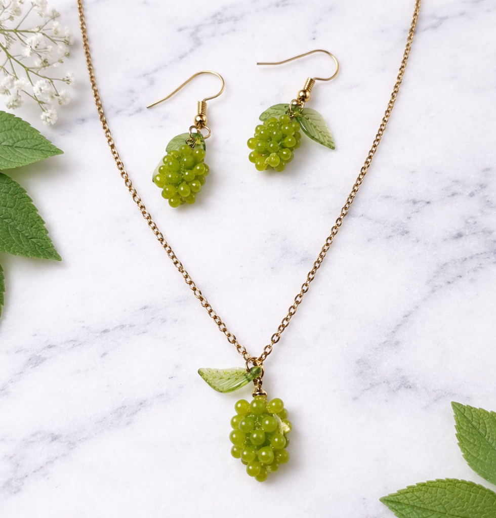 Necklace & Earrings Set โBeautiful handmade ๐ Yellow Grape Jewelry Set featuring a delicate necklace and matching earrings. Lightweight, cute, and perfect for adding a fresh fruity touch to your outfit.โ